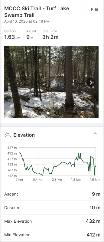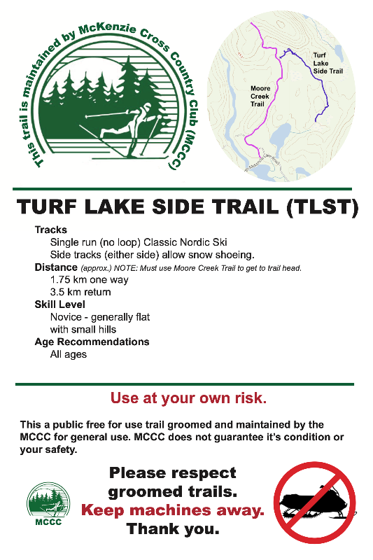 The Turf Lake Side Trail is a recent addition in 2019/2020 during the COVID years to expand the skiing off the common Moore Creek trail for greater distance and a wonderful change of scenery into denser wooded areas and marsh. An offshoot from the Moore Creek trail, relatively flat with a novice skill rating. The trail twists and winds its way through the woods with a few challenging spots and only moderate grade hills.